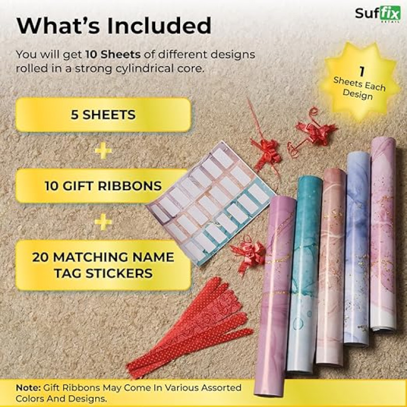 Suffix Retail ® - 5 Pcs Gift Wrapping Paper Sheets with Gift Ribbons & Gift Nametag Stickers | Gift Wrapping Paper Sheets - 19 x 28 INCHES (Multi, 5 Count (Pack of 1))