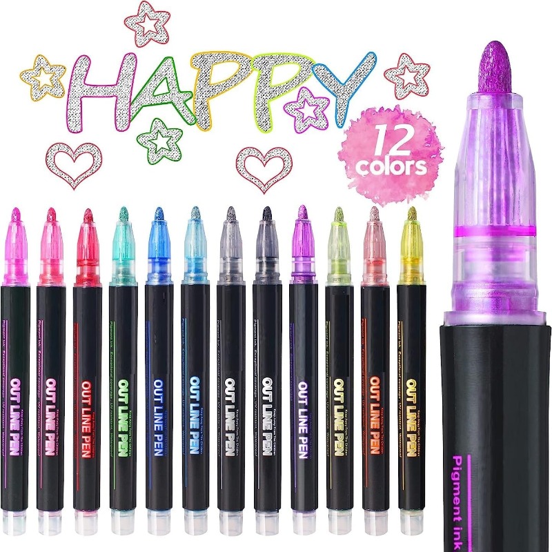 SUPER TOY 12 Pc Metallic Double Line Outline Markers Glitter Pen Set for Rock Painting, Glass, Mug, Wood, Fabric, Canvas, DIY Craft with Fine Medium Tip Perfect Creative Gift Idea