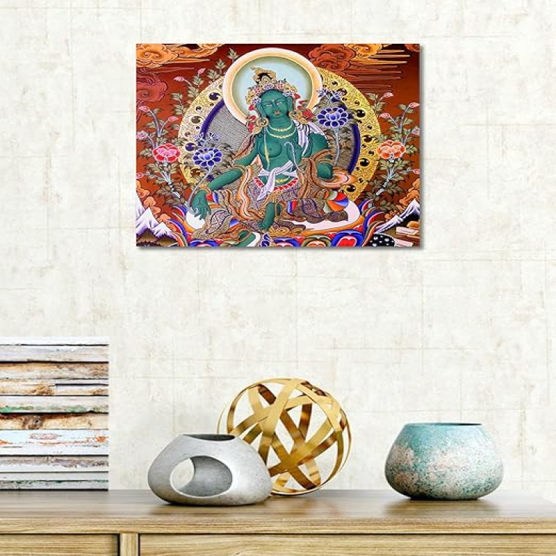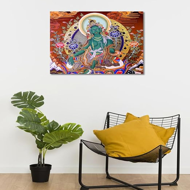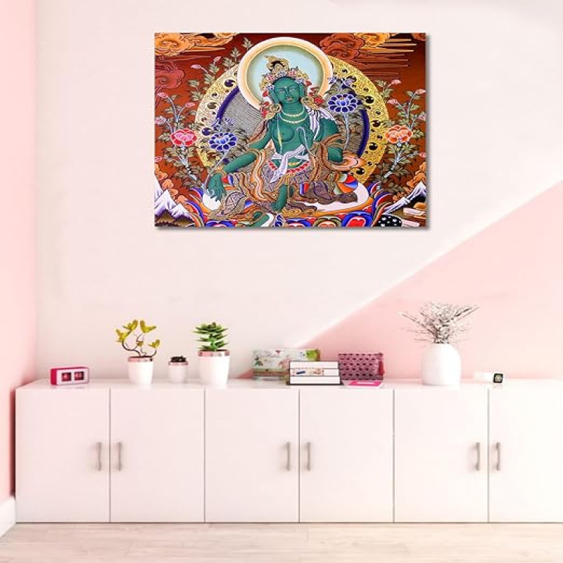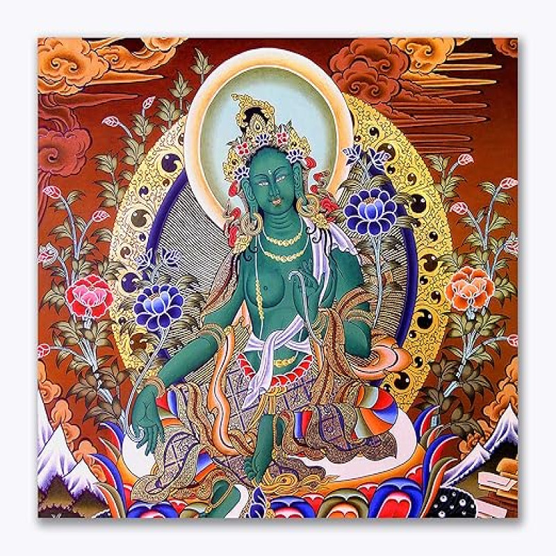 Tamatina Thangka Canvas Painting for Home, Living Room, Hall, Bedroom | Green Tara Goddess Traditional Painting for Home Decor | Size-13X11 Inches