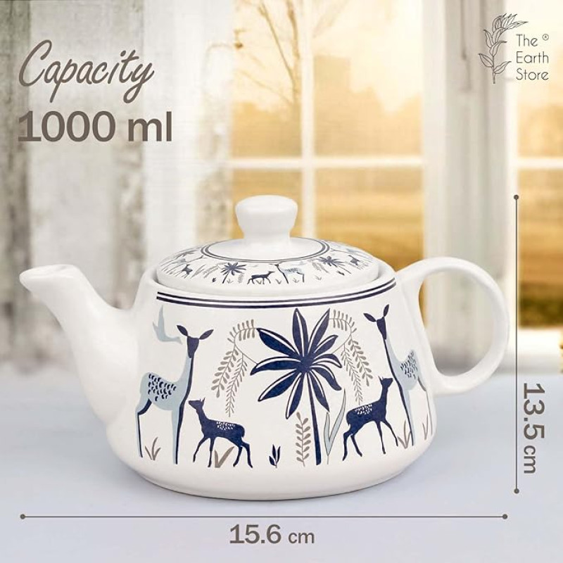 The Earth Store Handcrafted Ceramic Stag Blue Tea Cup Set with Kettle Microwave and Dishwasher Safe 6 Tea Cups & 1 Kettle | Tea Pot Set | Morning Set