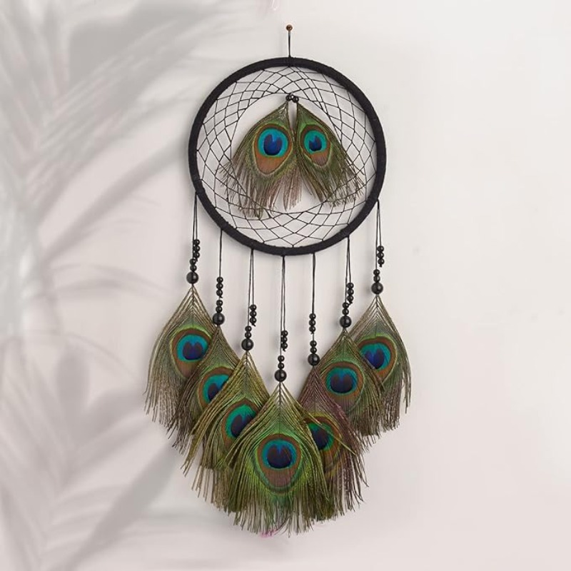 THE URBAN ARTISTIC Wooden Peacock Feather Dream Catcher for Positive Energy Decorative Showpiece Wall Hanging, Wall decor , Bedroom, Living Room Decor, Wall Vastu (18/45 cm) Black