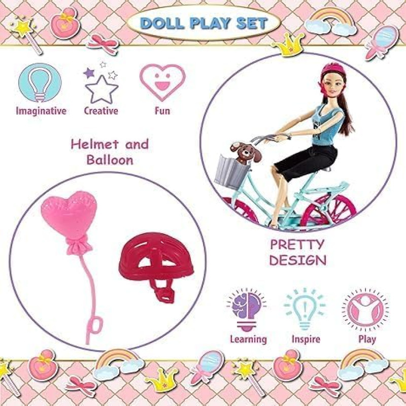 Tocexy Fashion Doll with Bicycle Play Set | Trendy Doll with Helmet, Puppy Basket & Accessories | Pretend Play Cycling Toy for Girls | Educational & Fun Role Play Set for Kids Ages 3+
