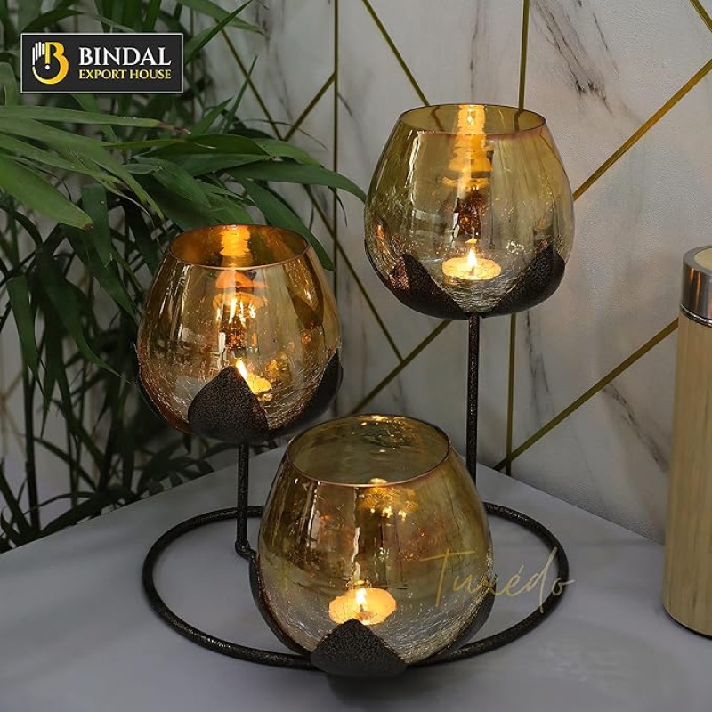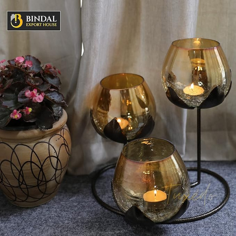 Tuxédo 3pc Ancient Bronze - Gold Glass Candle Holders - 3- Candlesticks Holders Gold Glass Candle for Home Decoration Dinning Table Decoration Candle Wedding Holiday Décor