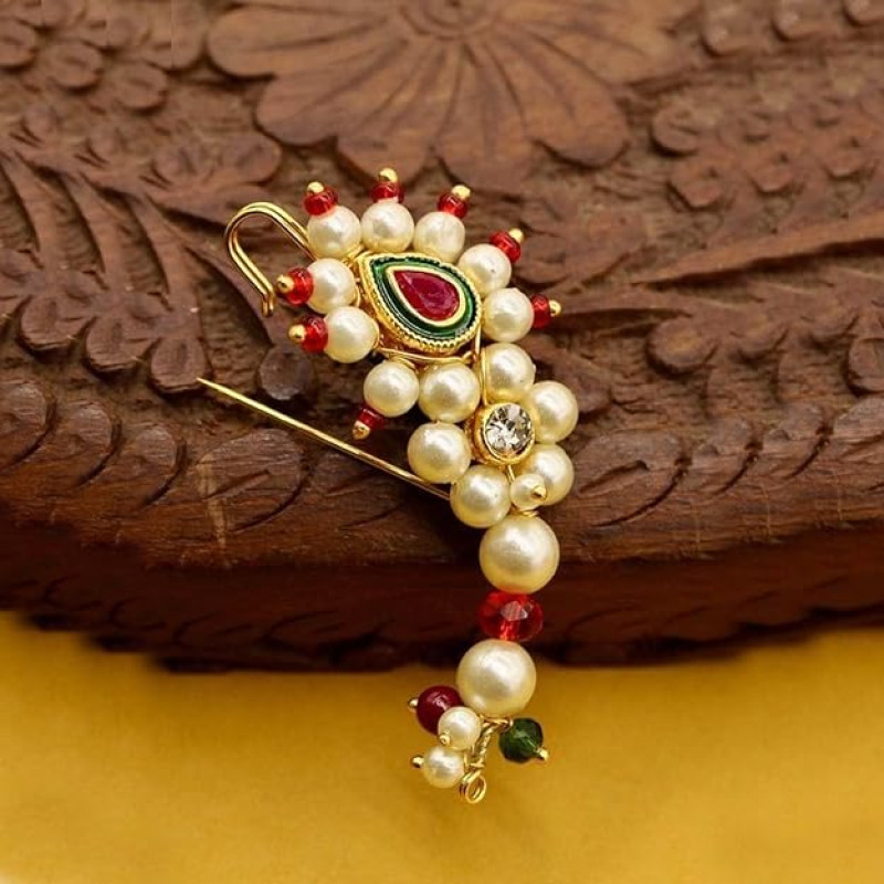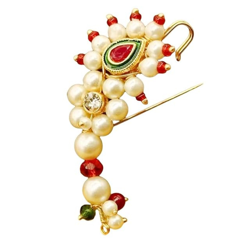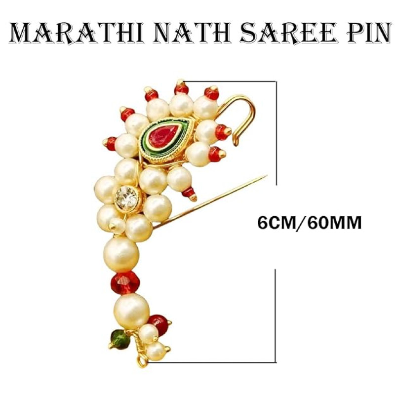 ✓ Stunning Banu Nath Design: Features a traditional Maharashtrian Banu Nath design Safety pin brooch, enhancing the elegance of your Nauvari and Paithani sarees.
