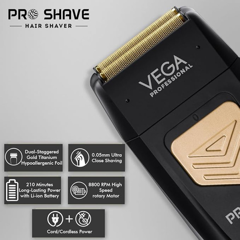 VEGA PROFESSIONAL Pro Shave Hair Shaver for Salon Professionals, Barbers and Salon-Like Shave at Home With Gold Titanium Foil & 210 Mins Runtime