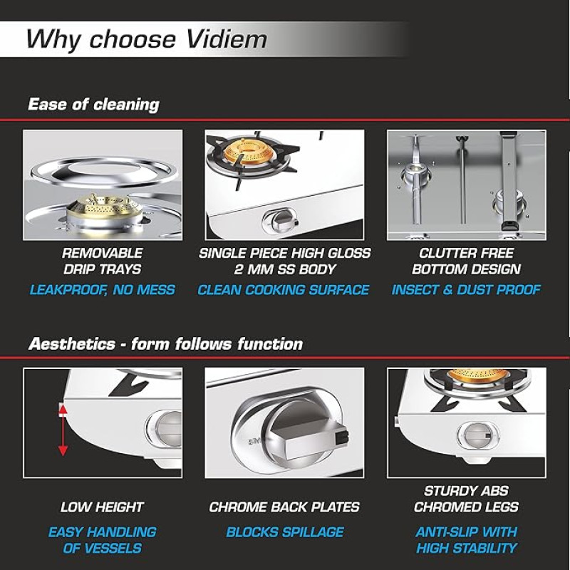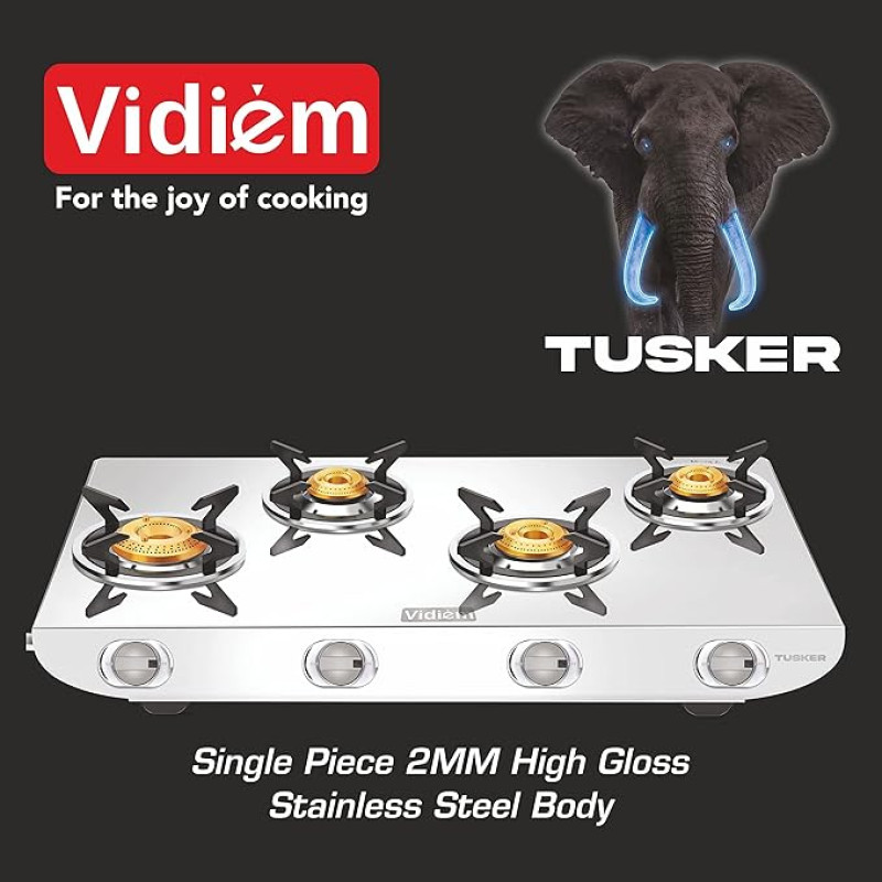 Vidiem Tusker 4 Burner ZZ Gas Stove | Heavy-Duty 2mm Stainless Steel Body | Dura-Forged Brass Burners | Manual Ignition | Lifetime SS Body Warranty