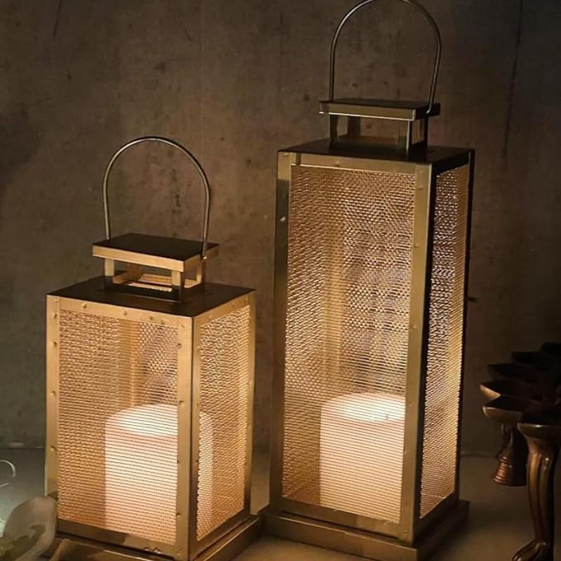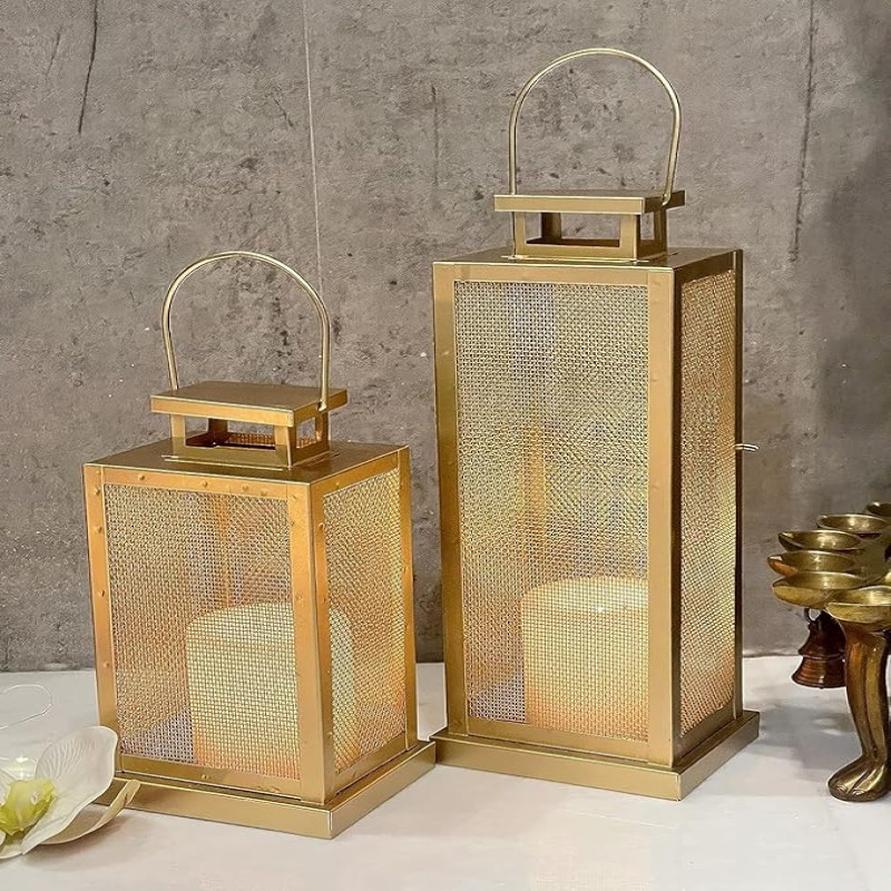 W A Handicrafts Set of 2 Iron Lantern and Candle Tealight Holder for Home Decor - Gold Lantern