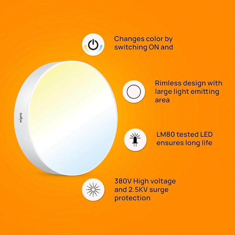 wipro Polycarbonate Garnet 12W Rimless Round CCT Surface Panel,Colour Changing Panel,Warm White,Neutral White,Cool White,Elegant Rimless Design,Surface Mounted LED Downlighter for Ceiling,Pack of 20
