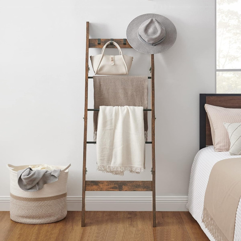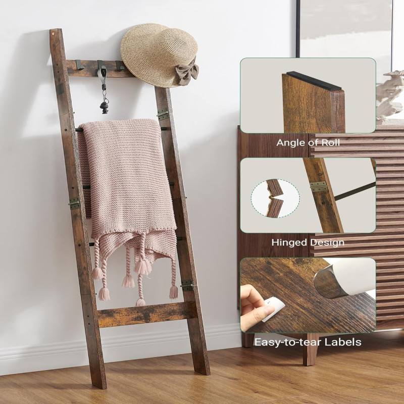 Wooden Grove 5-Tier Wooden Blanket Ladder – Rustic Brown Quilt Rack with 4 Removable Hooks, Decorative Ladder Shelf Organizer for Living Room & Bedroom (Brown, 5 Tier)