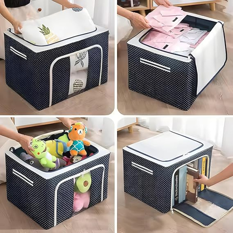 MERAO Oxford Clothes Storage Box Foldable Organizer With Steel Frame for Wardrobe, Saree, Shirts, and Blankets Clothing (50L x 40W x 33H Cm) (Pack of 1), Multicolor