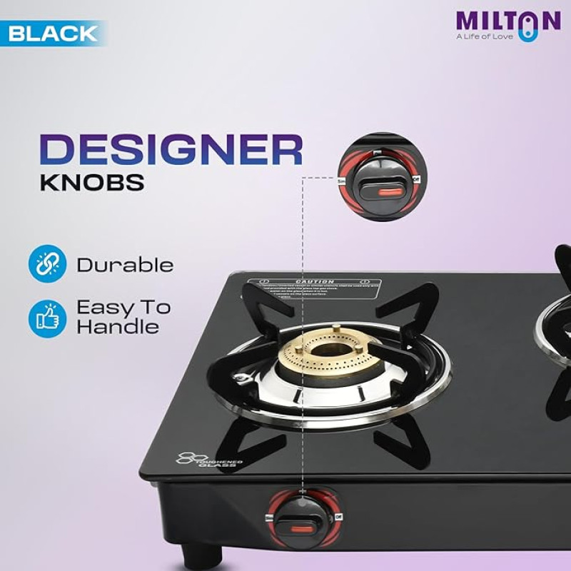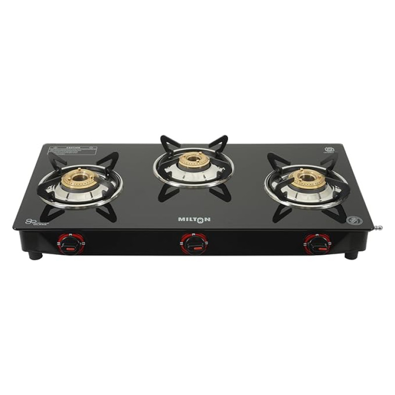 MILTON Premium 3 Burner Black Manual Ignition Glass Top Gas Stove, (ISI Certified)