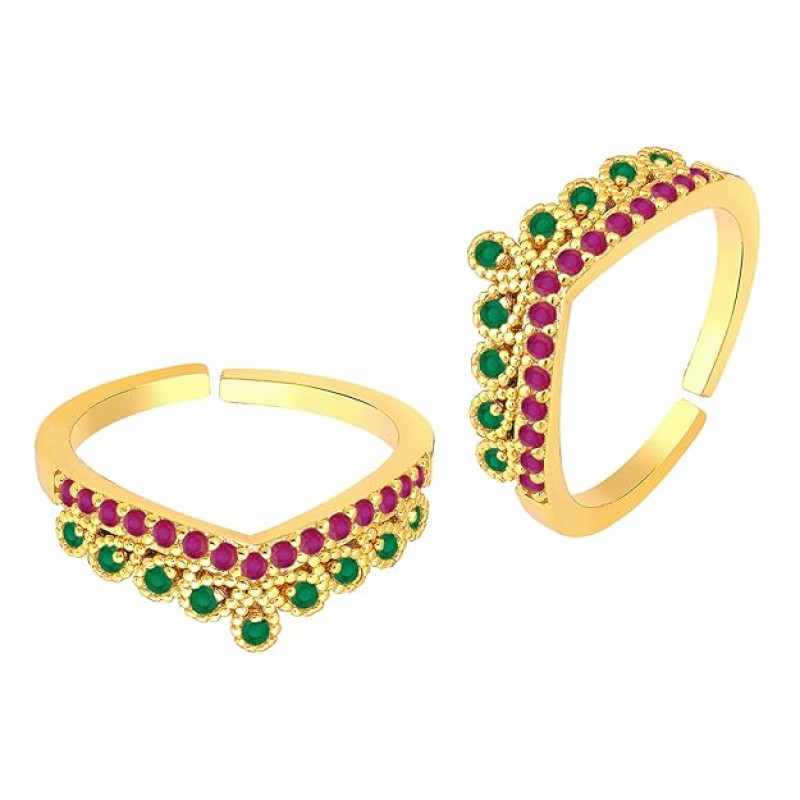 Peora Rani Pink Green Cubic Zirconia Studded Fancy Toe Ring Adjustable Gold Plated Bichiya Fashion Jewellery