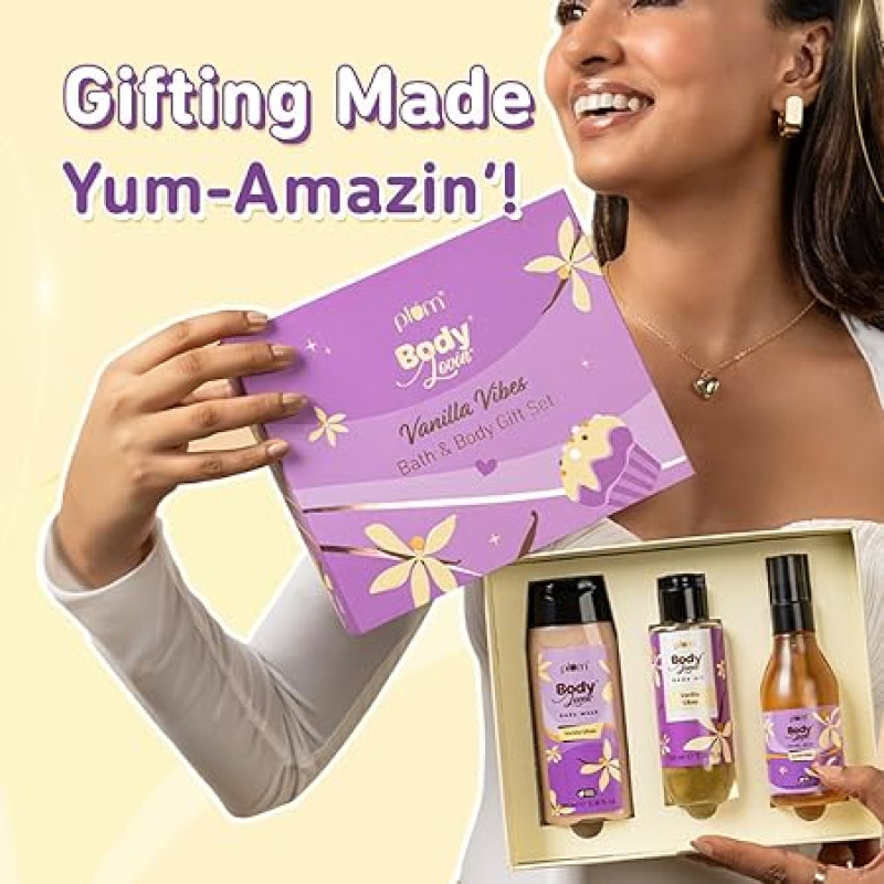 Plum BodyLovin' Vanilla Vibes Bath & Body Gift Set | Wash | Mist | Oil | Long-Lasting Fragrance | For Women | Gifting For Rakhi & Special Occasions| Pack Of 3 |