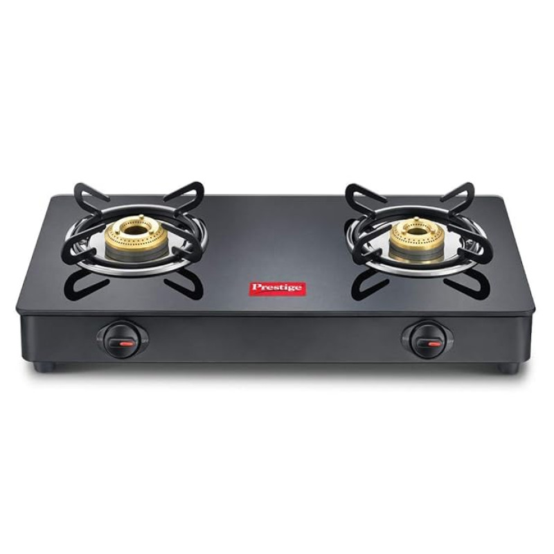 Prestige IRIS Toughened Glass-Top 2 Brass Burner LPG Gas Stove | Black | Spill Proof | Ergonomic Knobs | Tri-Pin Brass Burners |Open