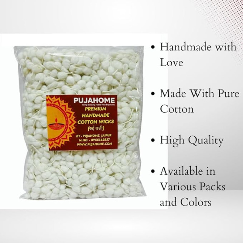 PujaHome Handmade Round Cotton Wicks | 1100 Pieces – Phool Batti for Pooja, Aarti, Navratri, and Spiritual Prayers | Ideal for Home Décor, Meditation, and Religious Ceremonies - White Cotton Batti