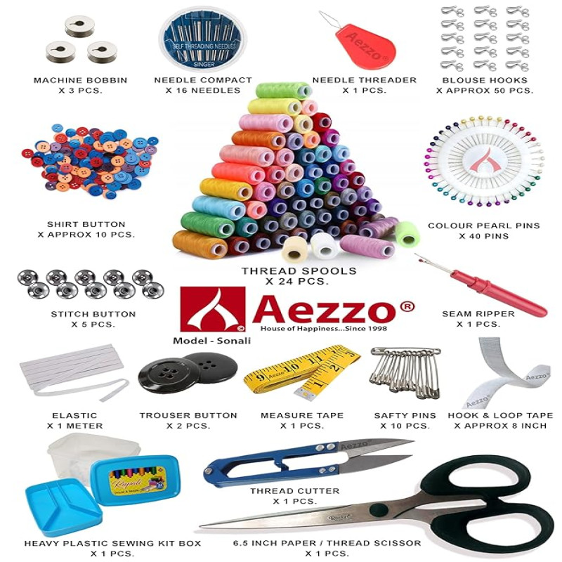 Included Components | Blouse Hooks, Bobbin, Color Pearl Pins, Elastic, Hook And Loop Tape, Measuring Tape, Needle Threader, Needles, Safety Pins, Scissor, Seam Ripper, Shirt Buttons, Stitch Button, Storage Box, Thread Cutter, Thread Spools, Trouser ButtonBlouse Hooks, Bobbin, Color Pearl Pins, Elastic, Hook And Loop Tape, Measuring Tape, Needle Threader, Needles, Safety Pins, Scissor, Seam Ripper, Shirt Buttons, Stitch B… See more |