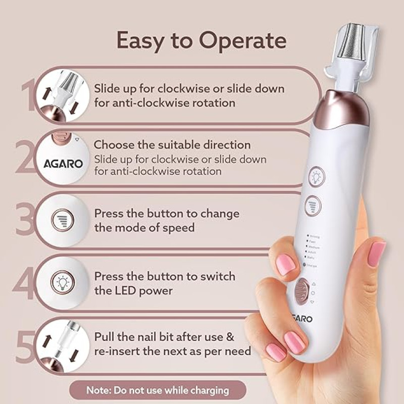 AGARO Prima Nail Drill & Polisher, Professional Nail Care at Home, Electric Nail Polisher, Manicure & Pedicure, Shape, Trim & Polish, 5 Speed, 8 Attachments, Rechargeable with Type C, Women, Men
