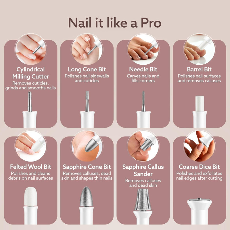 8 heads-Cylindrical Milling Cutter- to remove cuticles, grind and smoothen nails, Long Cone Bit to polishes nail sidewalls and cuticles, Needle Bit to carves nails & fills corners, Barrel Bit to polishes nail surfaces & removes calluses, Felted Wool Bit to polish and clean debris on nail surfaces, Sapphire Cone Bit to Remove calluses, dead skin & shape thin nails, Sapphire Callus Sander to removes calluses & dead skin, Coarse Dice Bit to Polish & exfoliates nail edges after cutting
