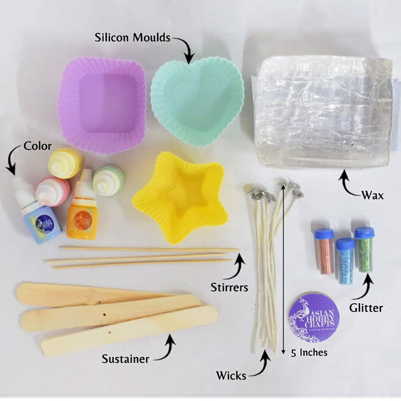 ✅ WHAT IS INSIDE THE BOX : Silicon Mould (3 Pcs Different shapes), Pigment Colors(6 Pcs), Ice Cream Sticks Natural With Hole (3 Pcs), Glitter Powder Random Color (3 Pcs), Stirrer (3 Pcs), 5" Wicks (3Pcs),Transparent Gel Candle Wax (150g),and User Guide