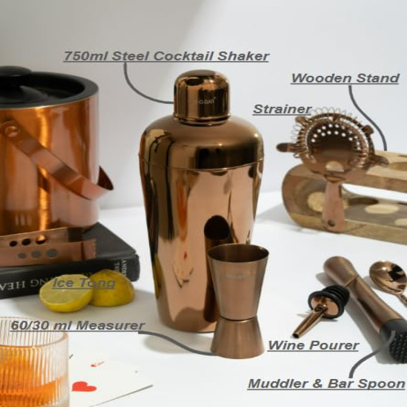 Premium Copper Gold Colour Stainless Steel Construction: Crafted from high-quality, food-grade stainless steel, each bar accessory in the Car-O-Bar Bar Set | Bar kit ensures durability and long-lasting performance.