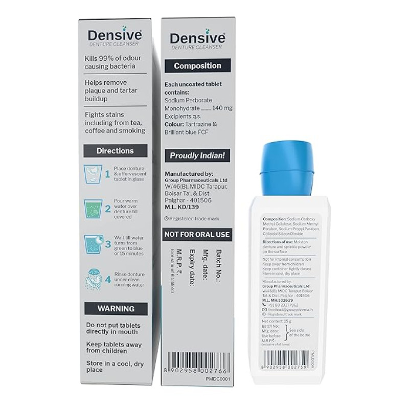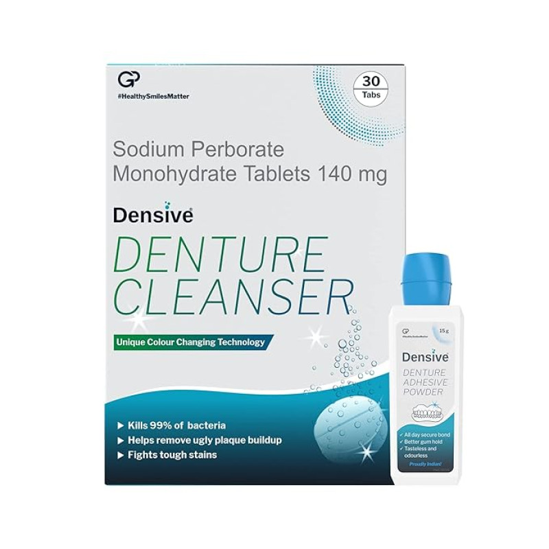 Densive Denture Cleaning Tablets and Denture Adhesive Powder Combo Pack of 6 (Pack of 3 x 30 Tablets and 3 Pack of Powder) | Denture Kit, Denture Cleaner, Denture Adhesive