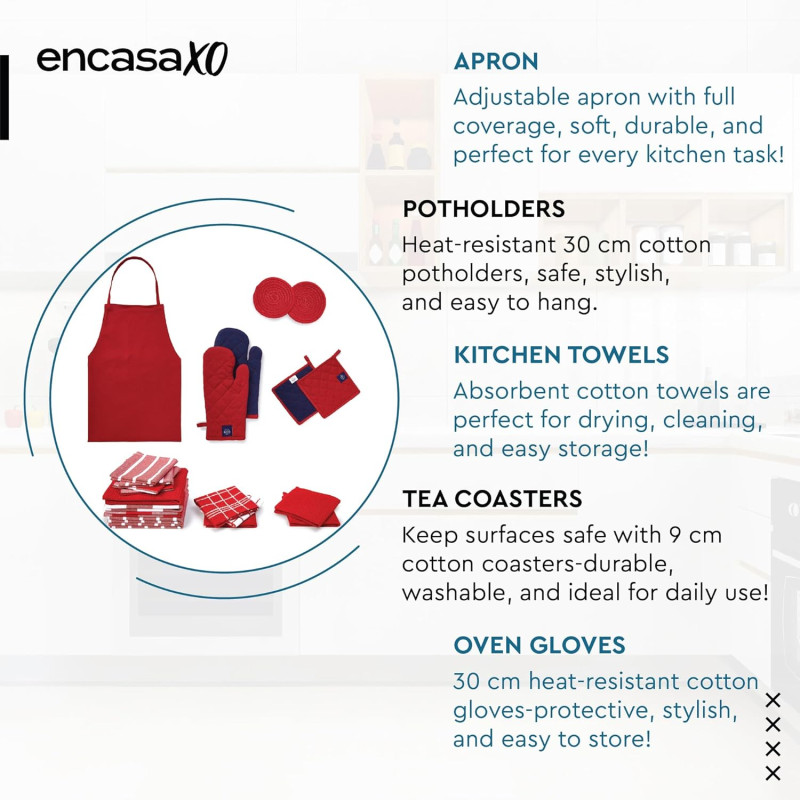 ALL ESSENTIALS IN ONE SET: Apron (74x64 cm) 1 Pc, Oven Gloves (18x30 cm) 2 Pcs, Pot Holder (21 cm) 2 Pcs, Kitchen Towel (70x45 cm) 5 Pcs, Dish Towel (30x30 cm) 9 Pcs