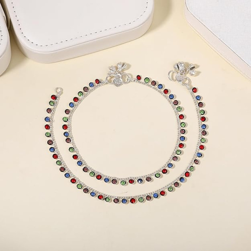 → Fashion Jewelry; Jewelry; Anklets; Chain Anklets; Chains for Legs; Latest Anklets; Designer Anklets; Anklets for Girls; Anklets for Women → Material: Alloy; Plating: Rhodium; Occasion: Casual & Festive Wear; Closure Type: S-Hook → Stone Type: Crystals; Stone Color: Multi-Color → Pack Contains: 1 Pair of Anklets → Dimensions: Length: 25.5 cm; Width: 0.6 cm; Height: 0.3 cm →Item Weight: 17.8 Gms