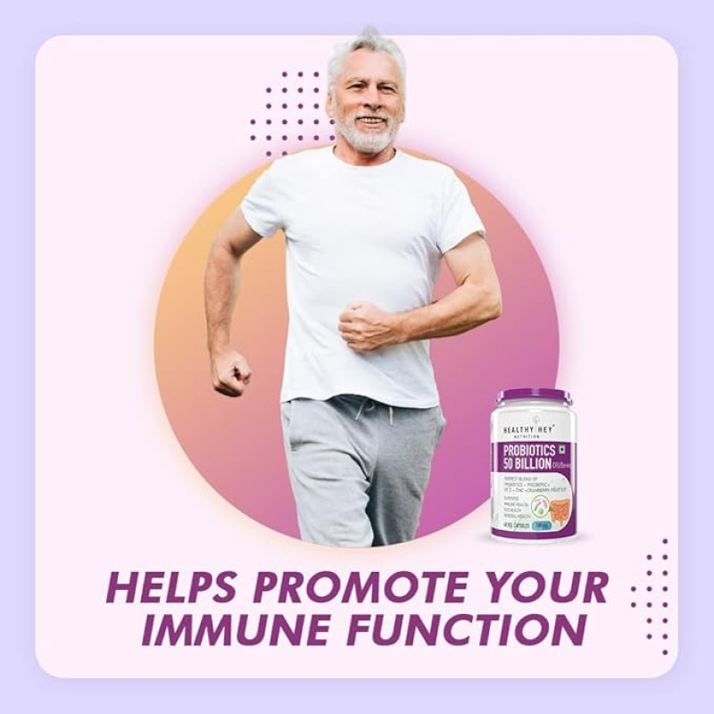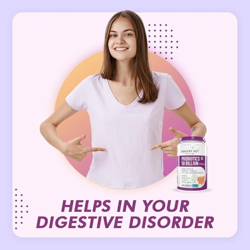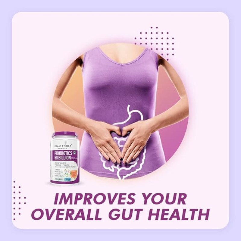 ★MADE IN INDIA★ HealthyHey Nutrition 50 Billion Probiotics supplement is produced in a state-of-the-art Mumbai facility, certified by FSSAI & USDA for quality and purity, supporting your gut health and overall wellbeing.