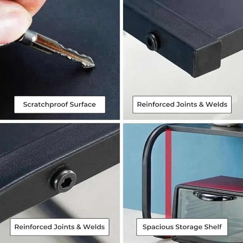 STURDY BLACK STEEL FRAME – This microwave stand for kitchen is made from high-quality steel, ensuring durability, rust resistance, and strong load capacity for OTG ovens, microwaves, and kitchen accessories.