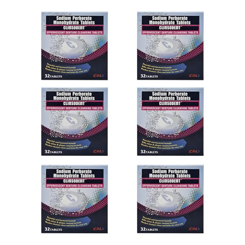 Mode of action: Specially formulated to clean all water insoluble residues from dentures that other cleansers may not remove. Clinsodents powerful antibacterial formula kills germs that causes odor and plaque. The baking soda and peroxide formula fight germs and whiten denture while refreshing dentures.