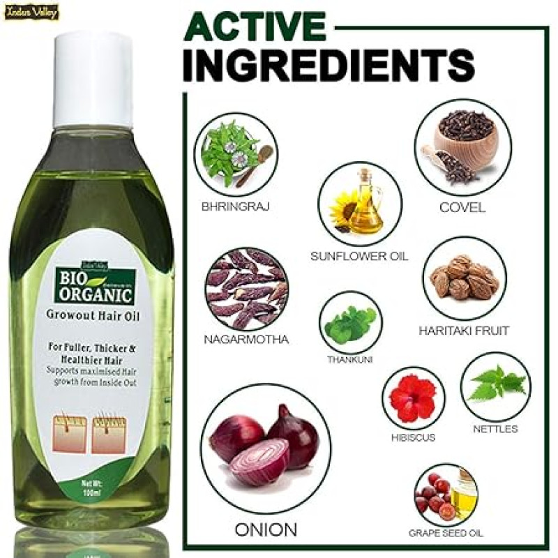 INDUS VALLEY Bio Organic Growout Hair Oil 100% Organic and Vegan Combats Dandruff, Flaky scalp, Frizz and Split Ends (100ml)