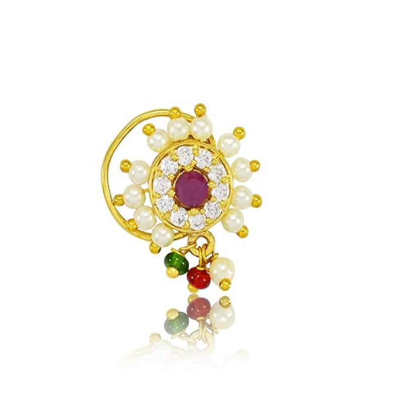 JEWELOPIA Maharashtrian Nath CZ Nose pin Traditional Bridal Nath Wedding Jewellery Marathi AD Nose Stud non piercing Pearl Gold Plated Clip On Press Nath Nose Ring For Girls