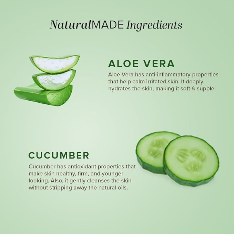 Benefit: A natural make-up remover in cream formulation with the goodness of cucumber and aloevera to completely break down your make-up without interfering with your skin's pH balance. Cucumber keeps your skin healthy and toned, relieves fatigue, and combats signs of premature ageing. Aloe vera keeps excess sebum at bay and is rich in antioxidants, which promote healing.