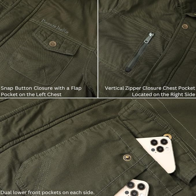 ✓ Ample Storage: Features 7 thoughtfully placed pockets: a secure zipper chest pocket, button-flap chest pocket, slant hand pockets, and an inner pocket for all your essentials.