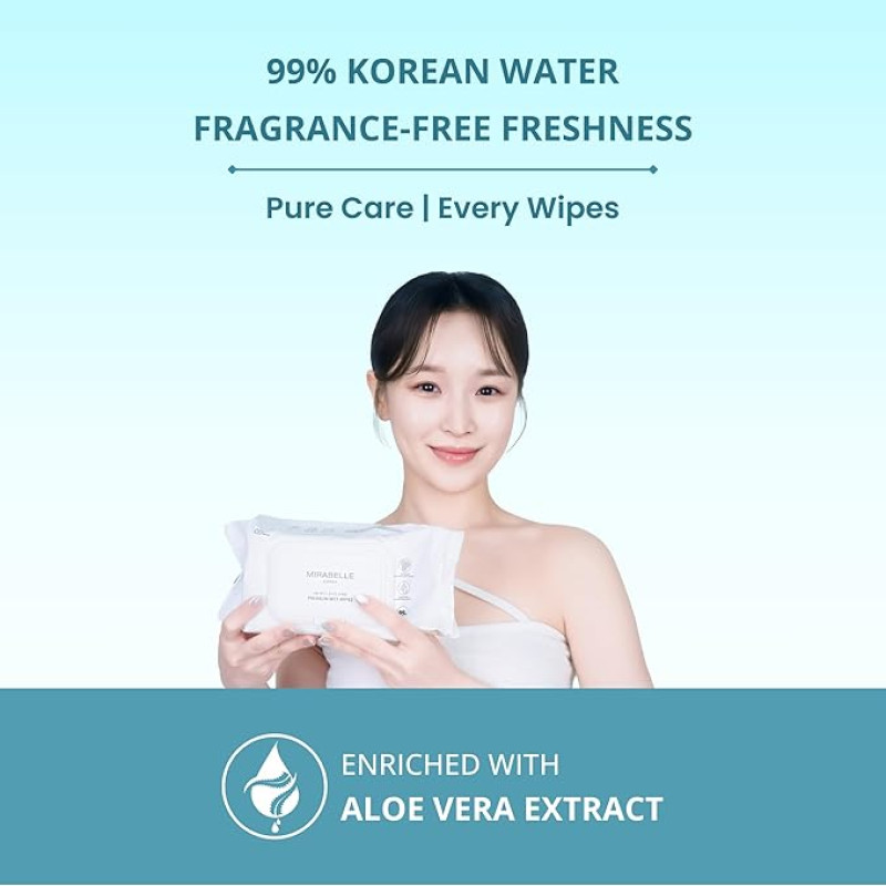 Mirabelle Korea Wet Wipes for Face with Lid - 100 wipes | 99% Pure Water, fragrance free | Makeup Remover Wipes | Hydrating & Refreshing | Korean Skincare | All Skin Types | Baby & Adult Safe
