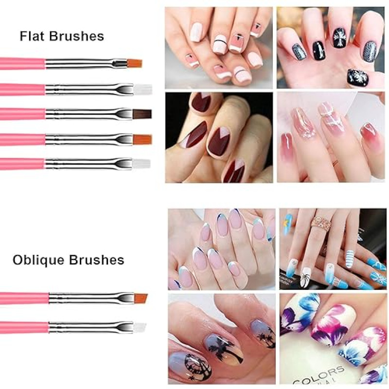 【15pcs Nail Art Brushes for Nail Art】 2 Flat Fan Brushes; 1 Angled Head Brush; 1 Pattern Brush; 2 Liner Brushes; 3 Flat Brushes; 3 Oblique Brushes; 1 Dotting Pen Brush; 1 Drawing Brush; 1 Petal Brush.Covers the range of brushes you'll need, different art brushes help you creating beautiful nail patterns easily.