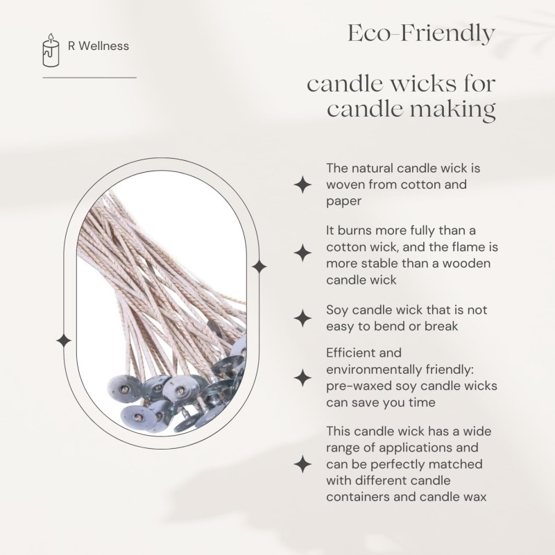 Candle Wicks for Candle Making DIY Candle Making Kit with 50 Pcs 3IN Eco Paper Wicks for Candle Making 50 Pcs Candle Wick Stickers 10 Pcs Wooden Candle Wick Holders Candle Making Material Braided Cotton Wicks pre-waxed in soy wax and with a metal base suitable for 2.5-3 inch candle jars.