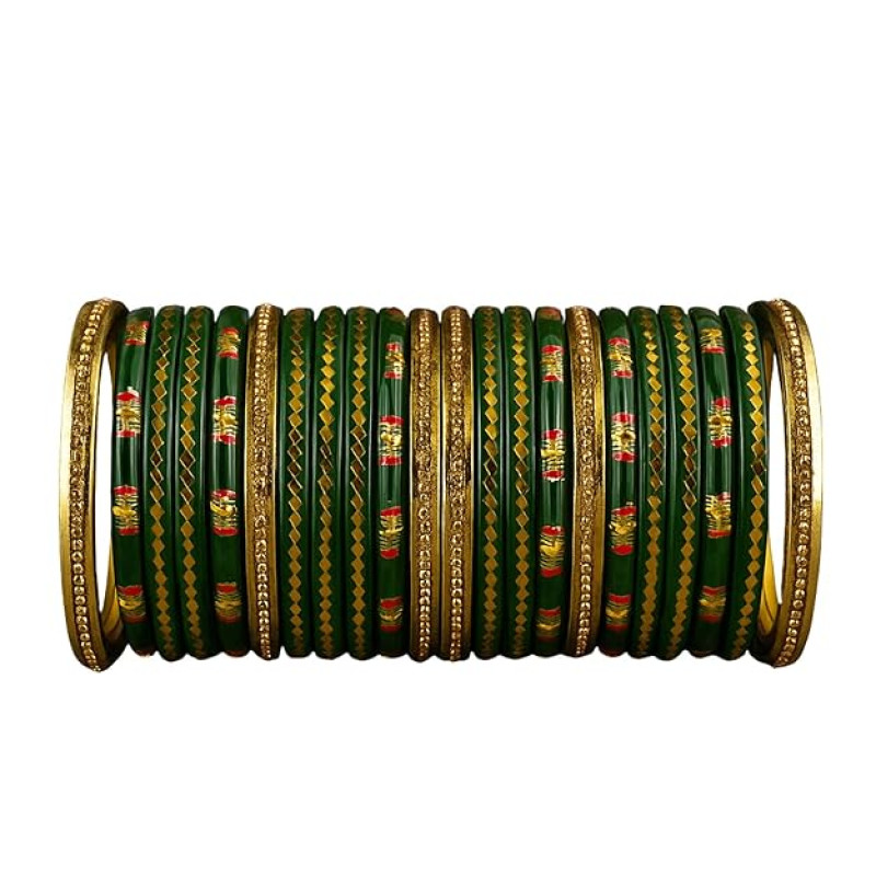 Traditional Green Muzafferpuri Lakh Bangles Set for Women | Bridal & Festive Kada Chura with Golden Detailing | Ethnic Indian Wedding Glass Look Bangles 12 Pcs