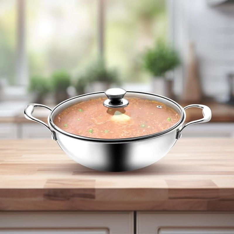 Triply Construction for Performance: Made with 3 bonded layers – food-grade SS304 stainless steel inner surface, aluminum core for fast and even heat distribution, and SS430 outer layer for induction compatibility.