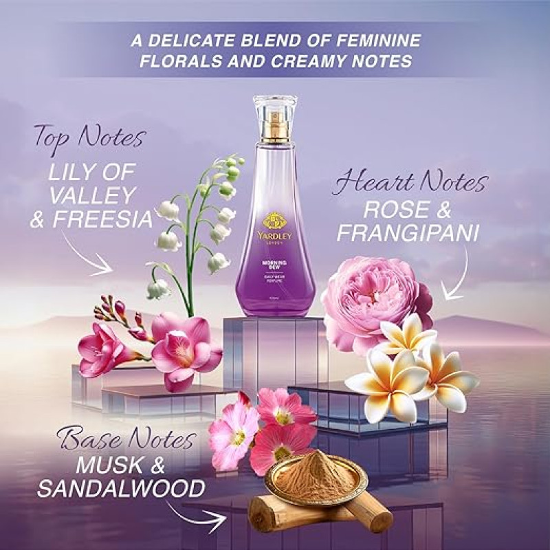A Morning Charm: Embrace the captivating, dewy morning scent of Yardley London Morning Dew DWP with Freesia, Rose, Mandarin, and Musk notes for a cheery start to your day