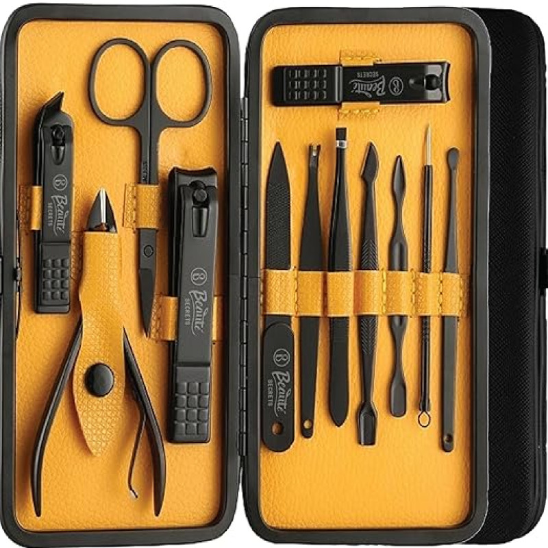 Beauté Secrets Essentials Manicure Set Nail Clippers, Stainless Steel Nail Scissors Grooming Kit, Acne needle, Blackhead Tool Leather Travel Case (Yellow)