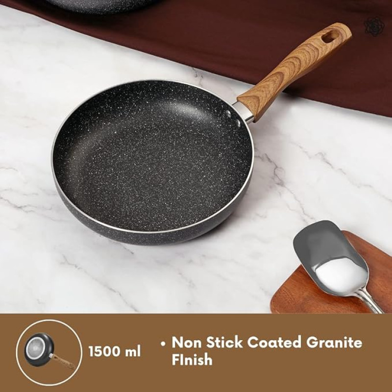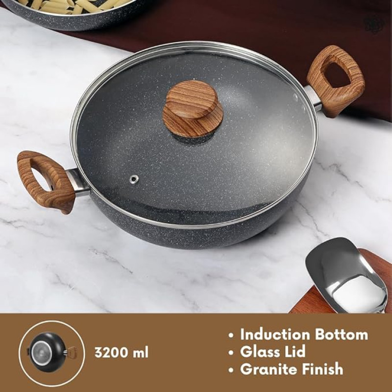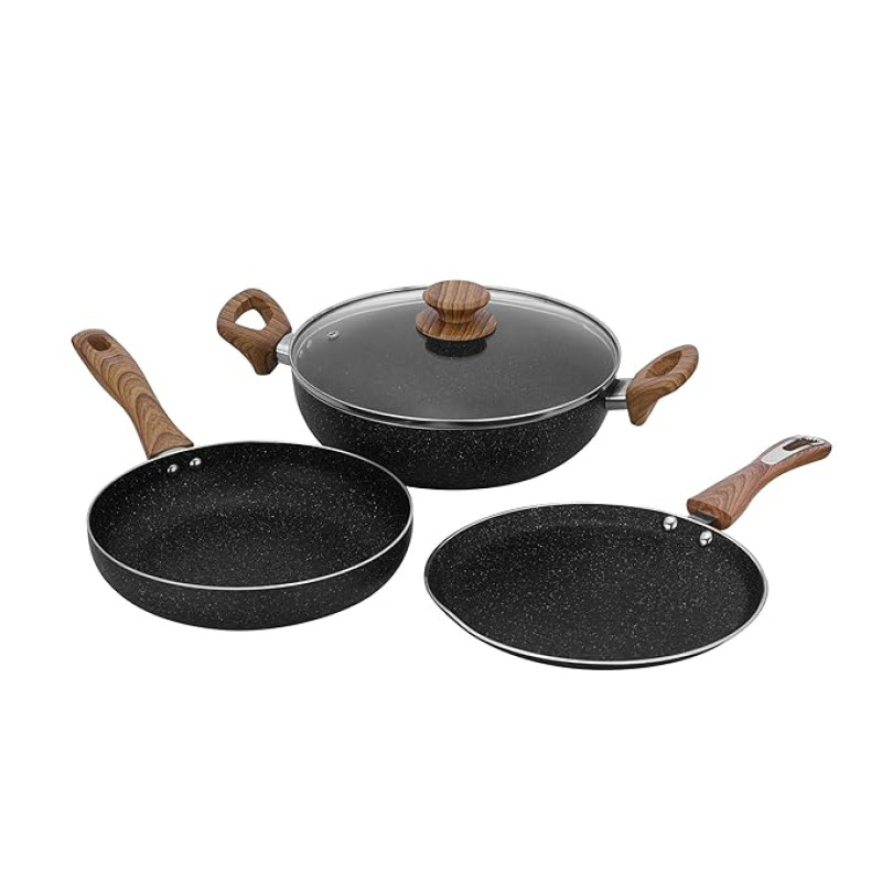 Chakmak Gravel Non Stick Granite 4 Pcs Cookware Set | Frypan 24cm 1500ml, Dosa Tawa 28cm, Kadhai with Glass Lid 26cm 3200ml | Gas & Induction Compatible, Granite Finish (4Pcs)
