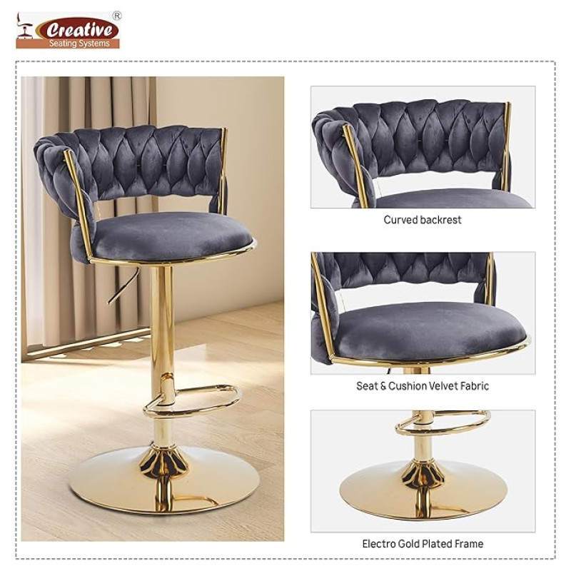 Creative Bar/Kitchen Chairs 360 Degree Rotatable Swivel Elegant Classy & Comfortable Chair with Golden Base and Velvet Fabric (Pack of 2) (Grey)