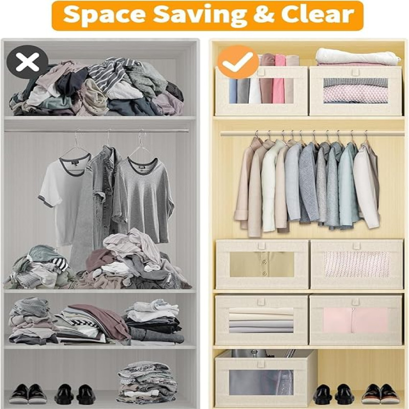 FLYNGO 4 Pcs Linen Wardrobe Organizer for Clothes Organiser Storage Box with Clear Window, Foldable Closet Organiser Basket for Clothing, Jeans, Pants, T Shirts, Toys | 40 x 27 x 17 Centimeters