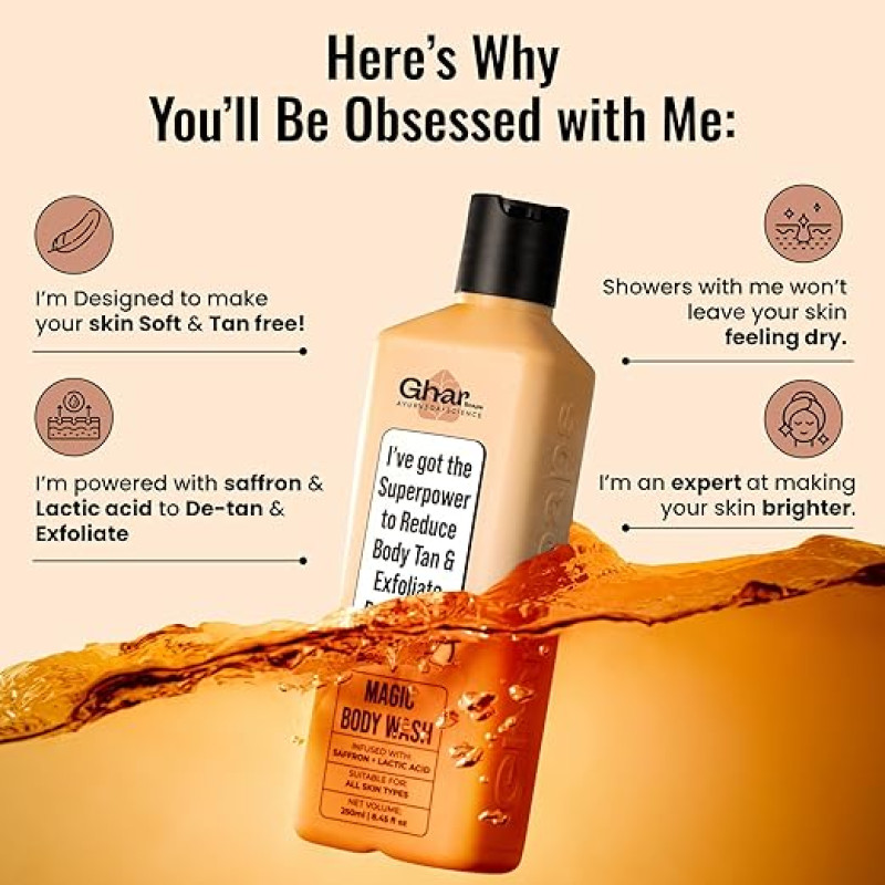 Ghar Soaps Magic De-Tan body wash for tan removal | Exfoliating Body Wash with Saffron, Lactic Acid & Niacinamide | Detan body wash | Removes Tan & Evens Skin Tone | Paraben & SLS Free