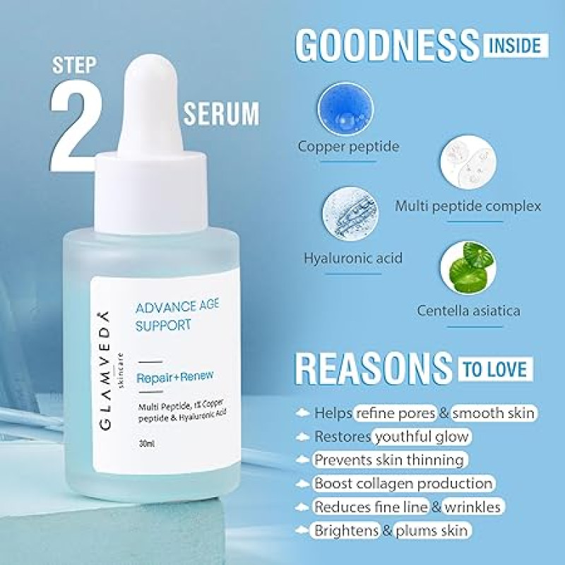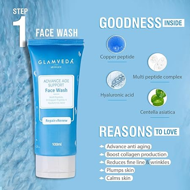 Glamveda 1% Copper Peptide & Hyaluronic Acid 5 Step Skincare Routine for Dull and Ageing Skin | Reduces Fine Lines & Wrinkles | Face Wash, Face Cream, Serum, Sunscreen, Under-Eye Patch