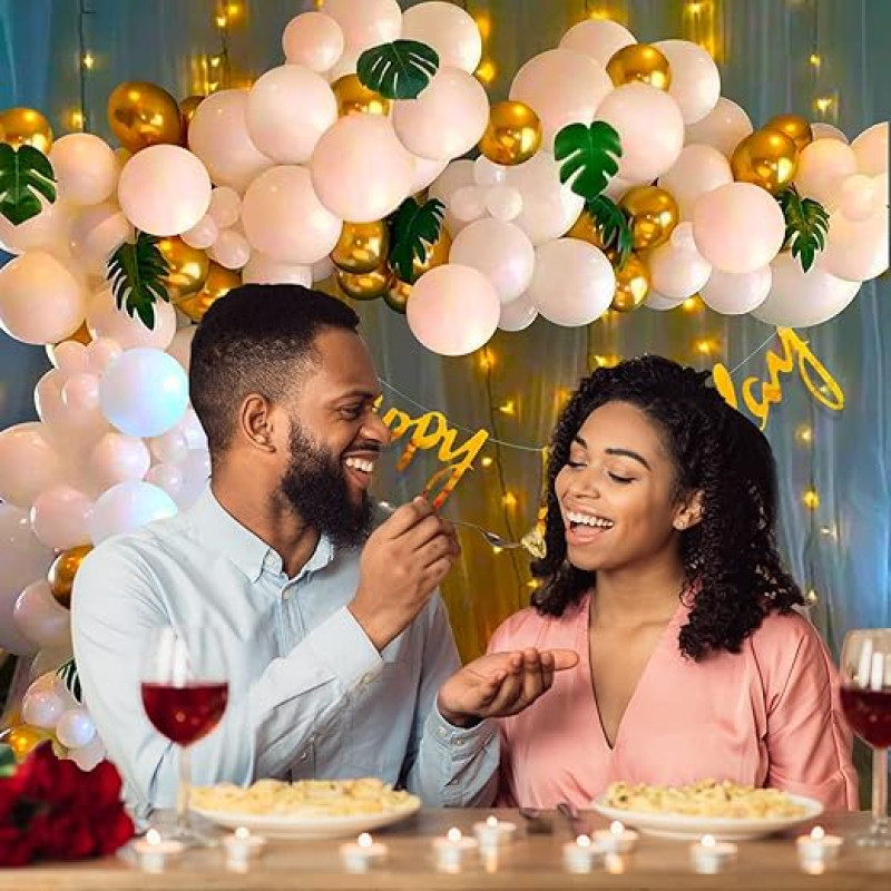 - HAPPY BIRTHDAY DECORATION KIT INCLUDES : 1pc happy birthday golden foil banner, 50pcs white metallic balloon (10-inch), 10pcs golden metallic balloons (10-inch), 2pcs white net curtains, 2pcs hanger, 1pc ribbon for birthday, 1pc balloon arch, 1pc glue dot roll. This white and gold birthday decor looks very pretty in girls bday decorating.