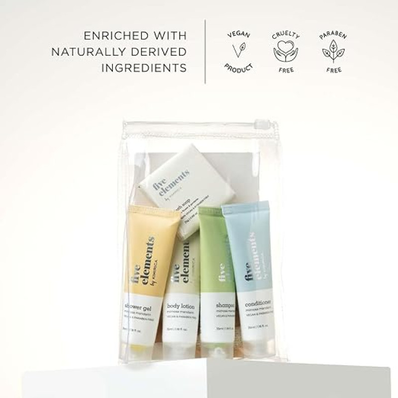 Kimirica Travel Kit Bath set Five Elements Luxury Bath and Body Care Travel Pouch Loofah| 6 in 1 self-care travel kit with a reusable pouch 100% Vegan |