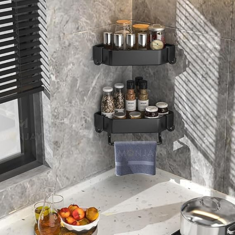 MONJAY Self-Adhesive Aluminium Bathroom Corner Shelf Rack Bathroom Corner Organizer Stand Bathroom Organisers Storage Racks Bathroom Shelf/Shelves Corner (King)(2 Shelf)