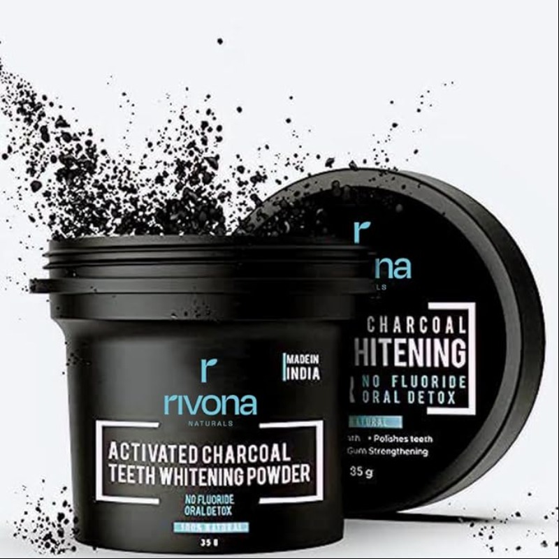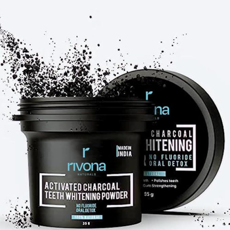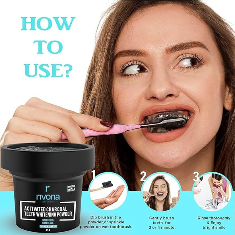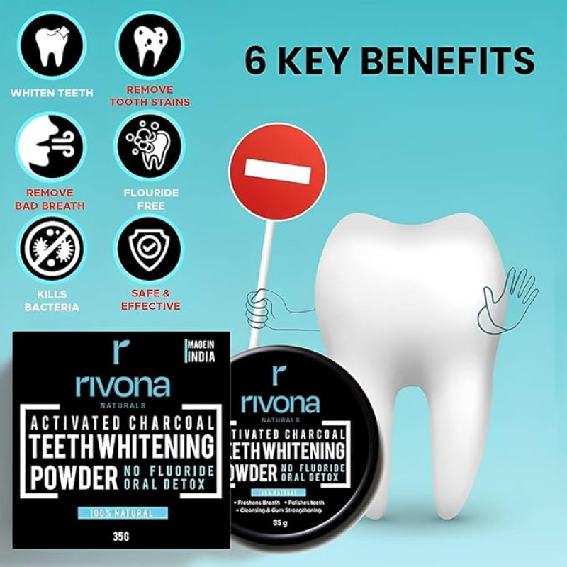RIVONA NATURALS Activated Charcoal Teeth Whitening Powder - For Enamel Safe Teeth Whitening, Stain Remover, Freshens Breath - With Activated Charcoal, Turmeric & Clove Powder - 35g (Fluoride Free)